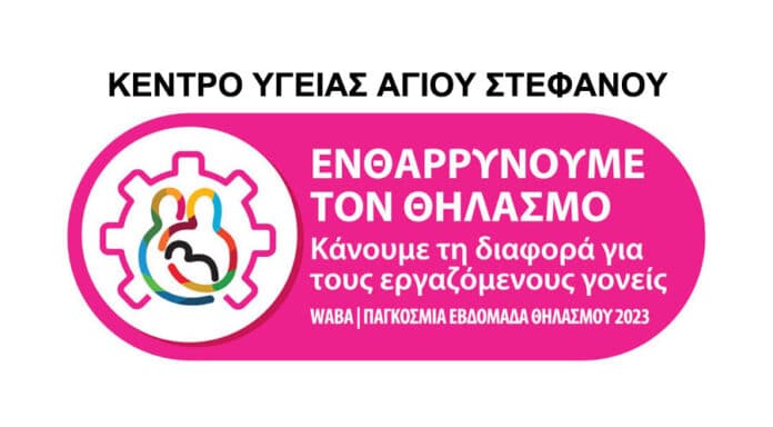Με αφορμή την Παγκόσμια Εβδομάδα Μητρικού Θηλασμού η οποία στην Ελλάδα γιορτάζεται από 1-7 Νοεμβρίου κάθε έτος και με σύνθημα «ΕΝΘΑΡΡΥΝΟΥΜΕ ΤΟΝ ΘΗΛΑΣΜΟ: Κάνουμε τη διαφορά για τους εργαζόμενους γονείς» το Κ.Υ Αγίου Στεφάνου και οι μαίες του καλούν την Παρασκευή 10 Νοεμβρίου 2023 από τις 09:00 -12:00 τις θηλάζουσες ή μη, μέλλοντες ή υπό σκέψη γονείς, και πρώην θηλάζουσες, σε Ανοικτό Σεμινάριο για ενημέρωση και συμβουλευτική σε θέματα Μητρικού Θηλασμού.