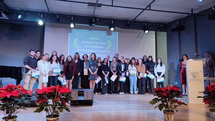 Τους νέους φοιτητές και τις φοιτήτριες που πέτυχαν την εισαγωγή τους το 2022 στην Τριτοβάθμια Εκπαίδευση βράβευσε ο Δήμος Διονύσου, σε μια λαμπρή εκδήλωση που πραγματοποιήθηκε την Τετάρτη 4 Ιανουαρίου 2023 στο κατάμεστο από κόσμο και νιάτα Πολιτιστικό Κέντρο Αγίου Στεφάνου, παρουσία του Δημάρχου Διονύσου Γιάννη Καλαφατέλη, της Υφυπουργού Τουρισμού Σοφίας Ζαχαράκη, του Βουλευτή Ανατολικής Αττικής Βασίλη Οικονόμου, του Αντιπεριφερειάρχη Οικονομικών της Περιφέρειας Αττικής και Αναπληρωτή Περιφερειάρχη Νίκου Πέππα, του Περιφερειακού Συμβούλου Αττικής Γιώργου Σμέρου, του Πρύτανη του Οικονομικού Πανεπιστημίου Αθηνών καθηγητή Δημήτρη Μπουραντώνη, του Αντιπρύτανη Διεθνούς Συνεργασίας και Ανάπτυξης (ΟΠΑ) καθηγητή Βασίλη Παπαδάκη, Αντιδημάρχων, Προέδρων Δημοτικών Κοινοτήτων, Δημοτικών και Τοπικών συμβούλων, του Γενικού Γραμματέα του Δήμου, μαθητών, γονέων εκπαιδευτικών εκπροσώπων συλλόγων και φορέων κ.α.