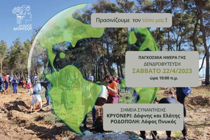 Πρασινίζουμε ξανά τον τόπο μας! Ο Δήμος Διονύσου διοργανώνει Δενδροφύτευση το Σάββατο 22 Απριλίου 2023 στις 10:00 π.μ., στο πλαίσιο του εορτασμού της Παγκόσμιας Ημέρας Γης.