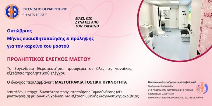 Πρόκειται για το ειδικό πακέτο ΜΑΣΤΟΓΡΑΦΙΑΣ – 3D ΤΟΜΟΣΥΝΘΕΣΗ που προσφέρεται από το Ευγενίδειο Θεραπευτήριο, κλινική «Η Αγία Τριάς» η οποία συμμετέχει ενεργά στο πρόγραμμα «Σπύρος Δοξιάδης – Μαστογραφία».
