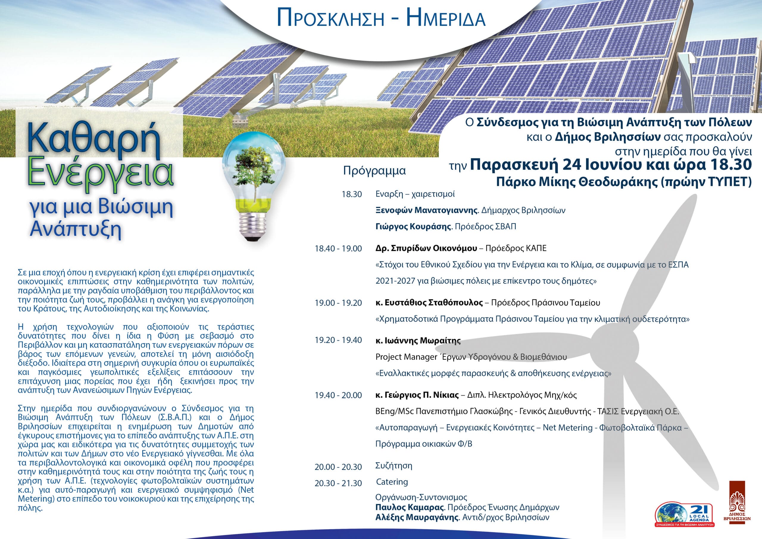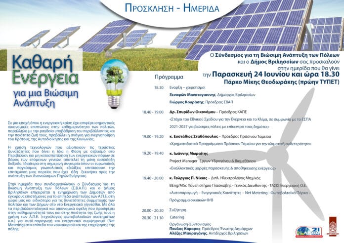 ΥΠΟΛΟΙΠΟΙ ΔΗΜΟΙΑυτοδιοίκηση ΗΜΕΡΙΔΑ ΚΑΘΑΡΗ ΕΝΕΡΓΕΙΑ για μια ΒΙΩΣΙΜΗ ΑΝΑΠΤΥΞΗ – ΣΒΑΠ – ΔΗΜΟΣ ΒΡΙΛΗΣΣΙΩΝ Από ΑΘΜΟΝΙΟΝΒΗΜΑ - 23 Ιουνίου 2022 0 μερίδιο FacebookTwitterPinterestWhatsApp