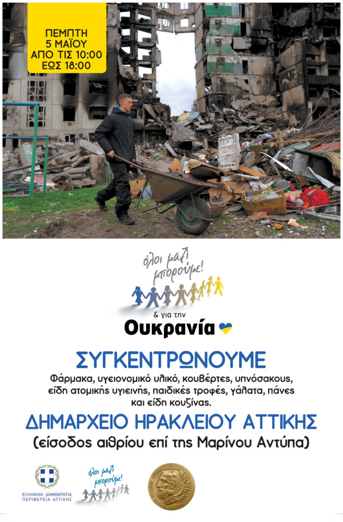 Όλοι Μαζί στηρίζουμε ξανά τον άμαχο Ουκρανικό πληθυσμό συγκεντρώνοντας πακέτα ανθρωπιστικής βοήθειας με είδη πρώτης ανάγκης και απαραίτητο υλικό το οποίο αφενός θα κατευθυνθεί στις εμπόλεμες περιοχές, αφετέρου θα διατεθεί στους 20 χιλιάδες, περίπου, Ουκρανούς πρόσφυγες που έχουν έρθει στη χώρα μας από την αρχή του πολέμου. Ο Δήμος Ηρακλείου Αττικής συμμετέχει στην κοινή προσπάθεια που κάνουν δήμοι και φορείς της Αττικής και καλεί όσους Ηρακλειώτες θέλουν να καταθέσουν τη δική τους προσφορά να το κάνουν την Πέμπτη 5 Μαΐου από τις 10 το πρωί έως τις 6 το απόγευμα μπροστά από το δημαρχείο της πόλης (είσοδος αίθριου επί της Μαρίνου Αντύπα).