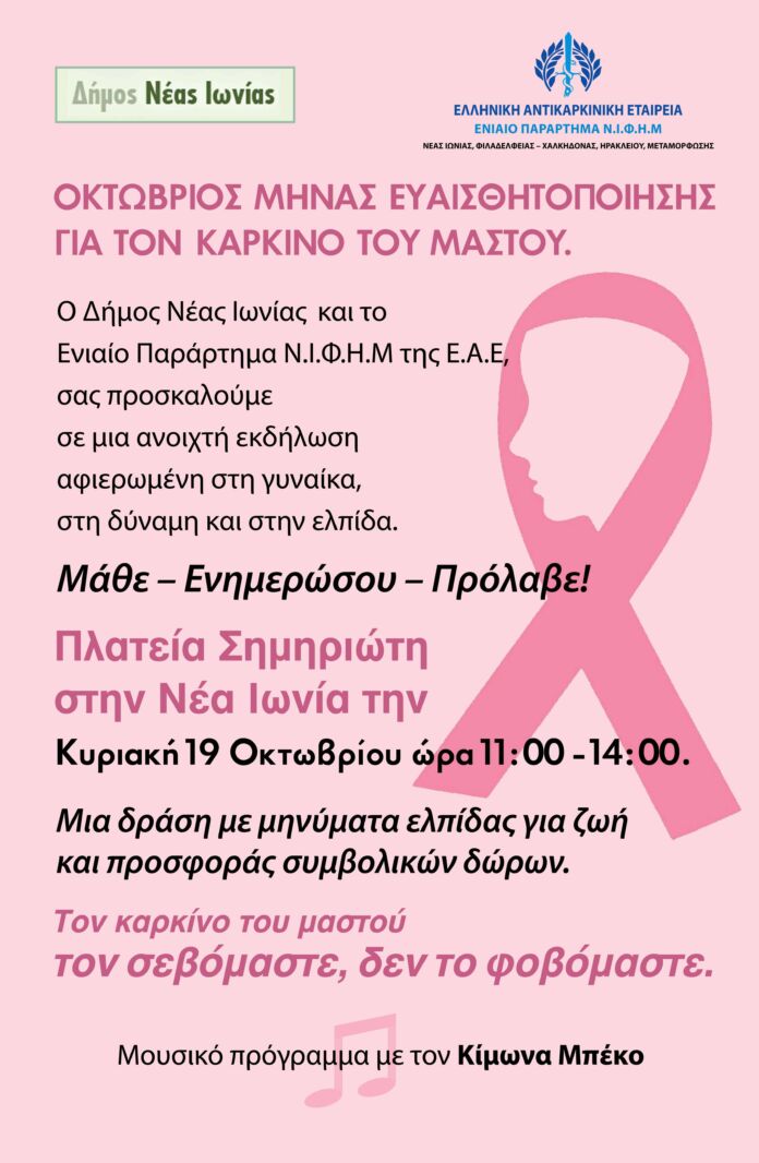 Ο Δήμος Νέας Ιωνίας συμμετέχει ενεργά στις δράσεις ενημέρωσης και πρόληψης για τον Καρκίνο του Μαστού, με αφορμή τον Οκτώβριο, που έχει καθιερωθεί παγκοσμίως ως Μήνας Ευαισθητοποίησης.