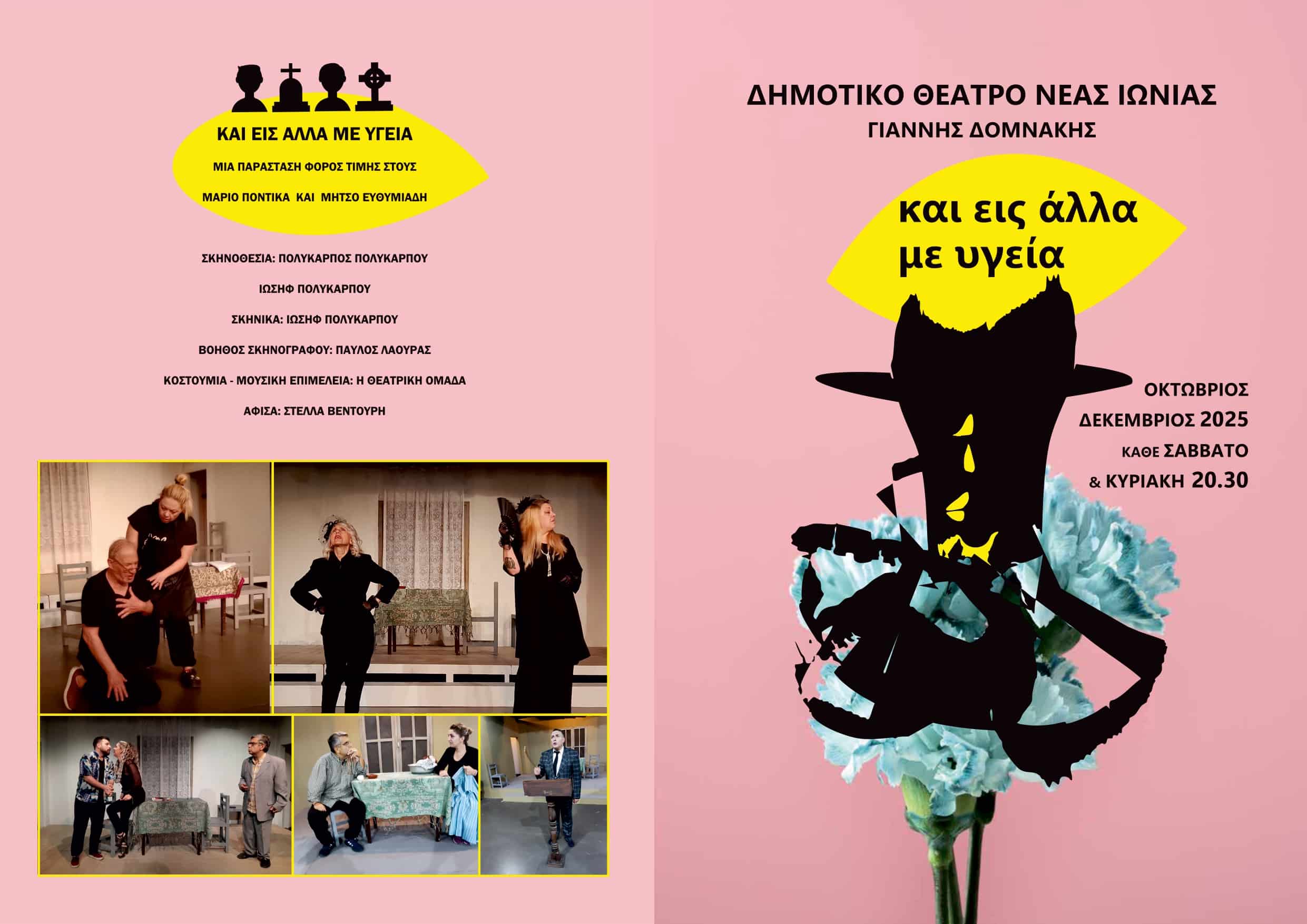 ΥΠΟΛΟΙΠΟΙ ΔΗΜΟΙΝέα Ιωνία Στο Δημοτικό Θέατρο Ν. Ιωνίας “Γ. Δομνάκης” η παράσταση “Και εις άλλα με υγεία” Από ΑΘΜΟΝΙΟΝΒΗΜΑ - 16 Οκτωβρίου 2025 0 μερίδιο FacebookTwitterPinterestWhatsApp Κάθε Σάββατο και Κυριακή στις 20.30 από Οκτώβριο ως και τον Δεκέμβριο οι 8 μονόπρακτες κωμωδίες σε σκηνοθεσία Πολύκαρπου και Ιωσήφ Πολυκάρπου Έναρξη: Κυριακή 19 Οκτωβρίου