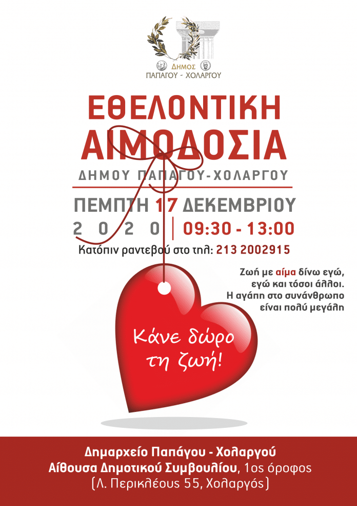Ο Δήμος Παπάγου Χολαργού, συνεχίζοντας την προσπάθεια για την κάλυψη των αναγκών σε αίμα, διοργανώνει Εθελοντική Αιμοδοσία την Πέμπτη 17 Δεκεμβρίου 2020 στην αίθουσα Δημοτικού Συμβουλίου του Δημαρχείου Παπάγου – Χολαργού, 1ος ορ.-Περικλέους 55, Χολαργός, κατά τις ώρες 09.30 έως 13.00.
