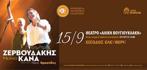 Μια ξεχωριστή μουσική βραδιά με τους Δημήτρη Ζερβουδάκη και Μελίνα Κανά και ελεύθερη είσοδο για όλους τους συμπολίτες μας διοργανώνει στο θέατρο Αλίκη Βουγιουκλάκη ο Δήμος Βριλησσίων τη Δευτέρα 15 Σεπτεμβρίου 2025 στις 21:00