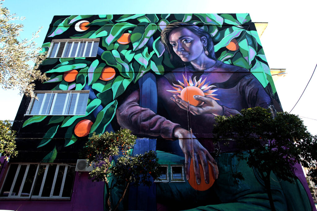 Κεντρική θέση στην τοιχογραφία έχει μια νεαρή γυναίκα που περιβάλλεται από την πορτοκαλιά, την οποία αγκαλιάζει, ως κάτι πραγματικά πολύτιμο και μοναδικό, με τον τρόπο, ίσως, που θα έπρεπε να «αγκαλιάζουμε» τη Φύση, προκειμένου να συνεχίσει να μας προσφέρει τα δώρα της.