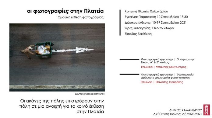 «Στο πλαίσιο του φωτογραφικού εργαστηρίου “Ο λόγος στην Εικόνα”, υπό την αιγίδα και στήριξη του Δήμου Χαλανδρίου για τέταρτη συνεχόμενη χρονιά, οι συμμετέχοντες είχαν την ευκαιρία να έρθουν σε επαφή με την Τέχνη της φωτογραφίας, μέσα από θεωρητικές προσεγγίσεις, βασικές γνώσεις τεχνικής, ιστορικές αναδρομές αλλά και παρουσιάσεις καταξιωμένων φωτογράφων. Ένεκα των ιδιαίτερων -λόγω πανδημίας- συνθηκών και περιορισμών, οι φωτογράφοι έστρεψαν το βλέμμα τους και τον φακό τους τόσο σε όψεις του οικείου και οικιακού χώρου και βίου, όσο και σε αστικά και περιαστικά περιβάλλοντα που συνήθως περνούν απαρατήρητα και σπάνια αναπαρίστανται. Μία ακόμη ιδιαιτερότητα της τρέχουσας χρονιάς ήταν ότι τα μαθήματα έγιναν αποκλειστικά διαδικτυακά μιας και η διάρκεια διεξαγωγής του σεμιναρίου συνέπεσε με το lockdown. Παράπλευρο όφελος της συγκυρίας αυτής υπήρξαν οι συμμετοχές και από άλλες πόλεις της Ελλάδας, αλλά και από το εξωτερικό. Ένα μικρό και αντιπροσωπευτικό δείγμα της δουλειάς των συμμετεχόντων φιλοξενείται στη φωτογραφική έκθεση της Πλατείας».