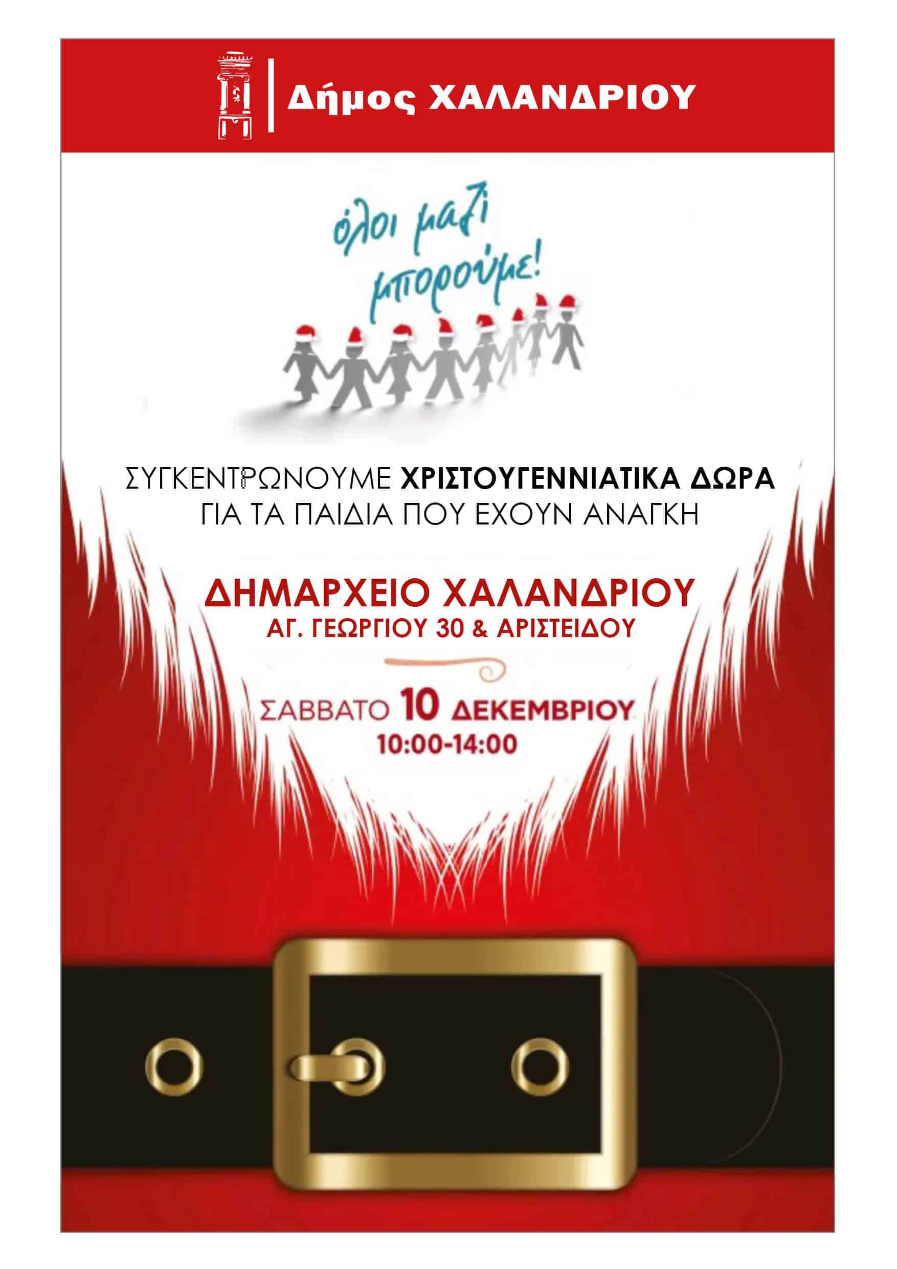Ο Δήμος Χαλανδρίου συμμετέχει και φέτος στην κοινωφελή δράση «ΌΛΟΙ ΜΑΖΙ ΜΠΟΡΟΥΜΕ», συγκεντρώνοντας χριστουγεννιάτικα δώρα για παιδιά.